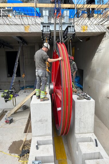 Ein weiterer wichtiger Meilenstein beim Neubau der Standseilbahn Hallstatt ist erreicht. Die beiden Antriebsscheiben wurden erfolgreich in die künftige Bergstation verbracht.