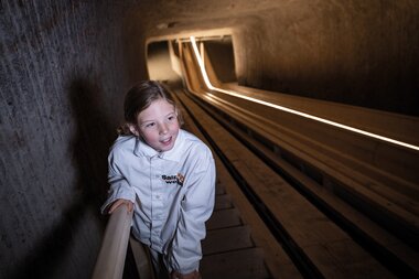 Wondering what on Earth a slide is doing inside a mine? In the past, when salt was still being mined in these tunnels, miners used wooden slides to travel quickly between the different mine tiers. In other words, they slid from higher to lower tunnels. That's why a so-called "butt leather" was part of the miner's outfit since the 16th century. That is to say: sliding protection for your rear end. Which is precisely why guests wear the miner's outfit we described above. During a tour of Salzwelten Salzburg, you'll actually tackle two slides: the first one is 24 meters long – just to warm up. The second is a whopping 42 meters in length! It's a ton of fun involving a decent amount of speed. And don't forget to smile while you’re sliding. Not only is your speed automatically measured, your photo will also be taken. Psst… the speed record is 40 km/h (24 mph). Think you can you beat it?